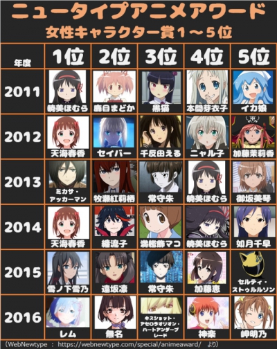Пользователь твиттера @kasumi1973 провёл исследования и соединил в сводный чарт всех победительниц в категории "женский персонаж" журнала Animage и Newtype. До 1983 года в категории "лучший персонаж" не было разделения по полам, а премию в 1979 взяли Captain Harlock и Char Aznable, затем в 1980 Joe Shimamura из "Cyborg 009", а в 81-82-годах приз достался Takeru Myoujin из "Six God Combination Godmars".